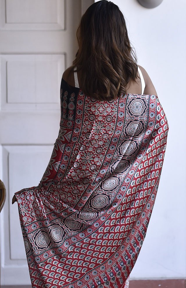 Soliloquy is a conversation held in colour and pattern. Its layered motifs unfold like thoughts—measured, intricate, deeply felt. The red is warm rather than loud, grounded by darker borders that steady the gaze. There is a contemplative elegance in its drape, inviting pause and presence. Boldness here is intellectual, not performative. It belongs to quiet afternoons and long evenings that drift into night. A saree worn not to be seen, but to be remembered.
